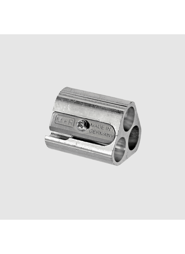 Triangular three-hole sharpener made from milled magnesium. An unsual design, the three holes each sharpen standard width hexagonal, round or triangular pencils.